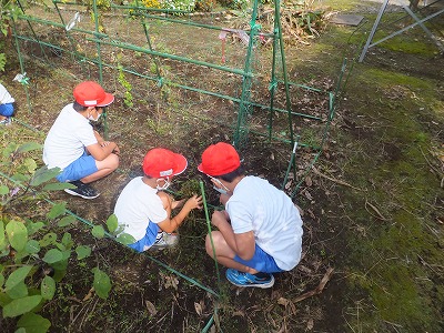 ナス、キュウリ、オクラ、トマト、トウモロコシ、枝豆を育て、たくさん収穫してきましたが、今日は農園の草とりや枯れた野菜の片付けをしました。