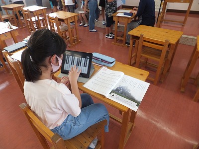 テストが合格したら、牧場の朝の練習です。iPadのピアノで練習します。