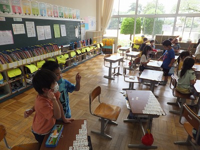 カードを並べて、並び方について気が付いたことを発表しています。