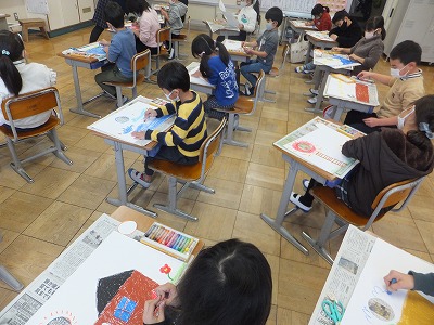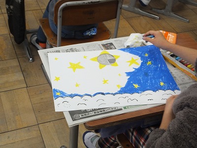 図工の時間は、画用紙に丸い穴を開けて、その穴を利用して絵を描き、表が終わったら裏にも絵を描きました。