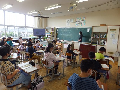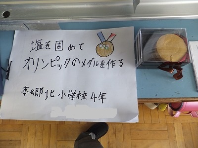 教室の後ろに夏休みの自由研究が展示されていました。実際に塩メダルを作ったところがいいですね。