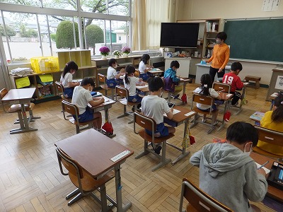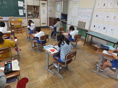 姿勢に注意しながら書いています。段々目がノートに近づいてしまう子もいます。