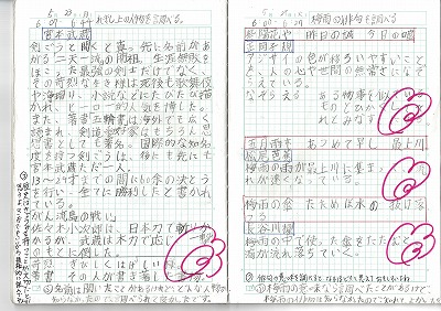 宮本武蔵など歴史上の人物を調べたり、梅雨の時期の俳句について調べたりしています。工夫が見られますね。