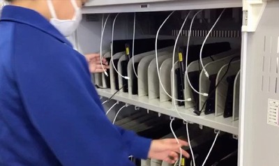 学習係です。提出物のチェックをしたり、タブレットの保管しやすくしたりしています。