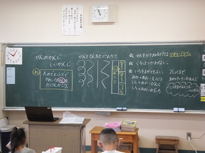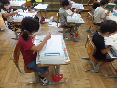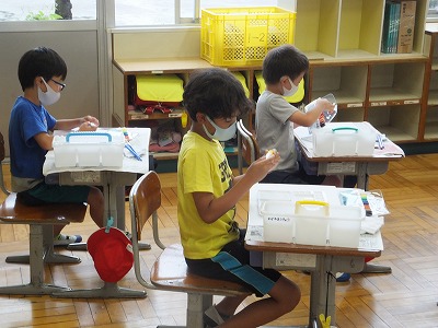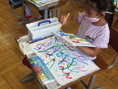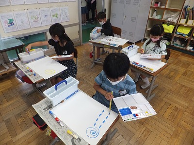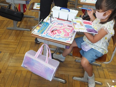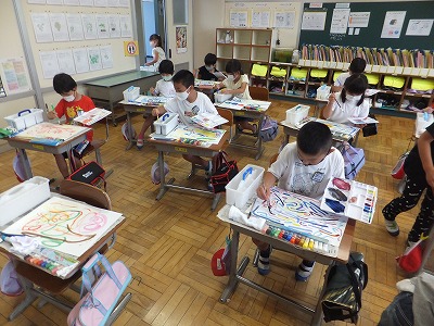 前回は初めての絵の具の使い方だったので、保護者の皆様にボランティアをお願いして指導しましたが、今回は自分一人で同じようにできるかがポイントです。