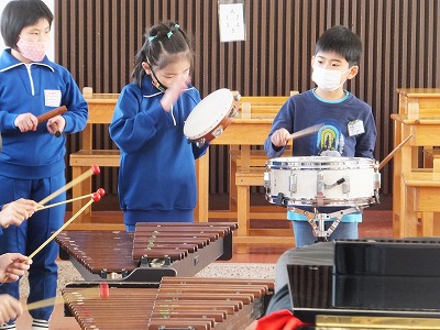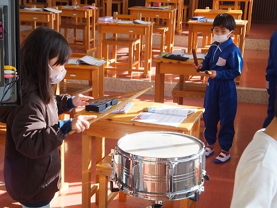 感染症対策のため、しばらくは鍵盤ハーモニカは吹きません。その代わり打楽器で合奏です。