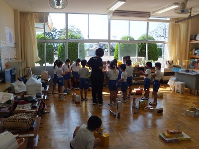 輪ゴムを鳴らすので、いい音とまではいきませんでしたが、自分の作った楽器で嬉しそうに音を出していました。