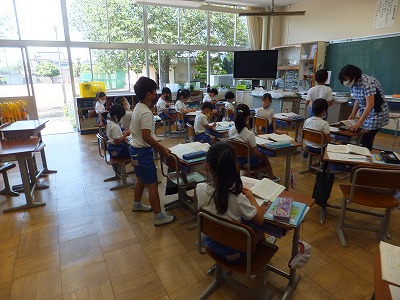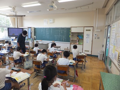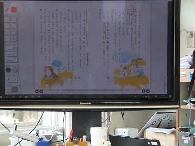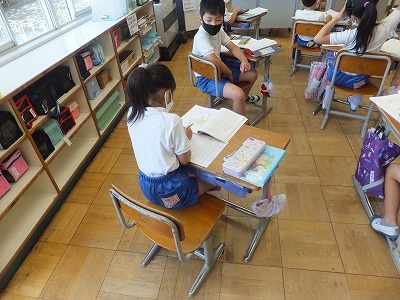 国語は、声やうごきで あらわそう「名前を 見て ちょうだい」という物語を読んでいます。登場人物や場所に着目しながら場面わけをし、えっちゃんとえっちゃんが出会った人物の行動や会話文をもとに、人物の気持ちや表情、声を想像しながら読むことができるようにするのが目標です。