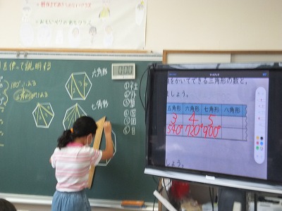 三角形は3-2で三角形が一つ。四角形は4ー2で三角形が二つ。5角形は5-2で三角形が3つ。・・・・・いいことに気付きました。十角形なら三角形はいくつかな?