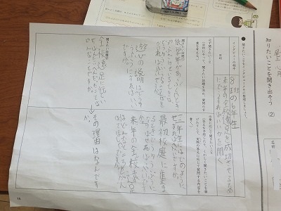 5年生として、6年生にこんなときはどうしたらいいのかインタビューするのは、とても良いことです。今のうちから6年生になる心構えを少しずつ作っていきましょう。