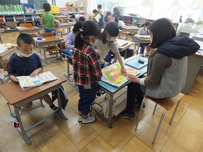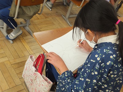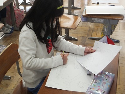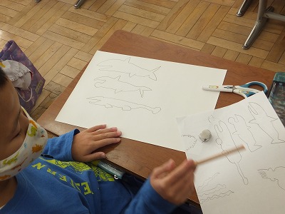 色を塗り終わった子は、シールになっている紙に絵を描いています。