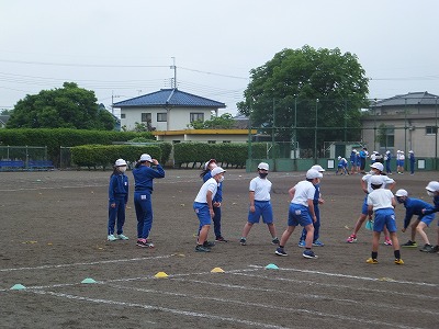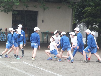 補助ですが、まずは準備運動。5年生は自分たちでやってます。