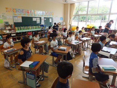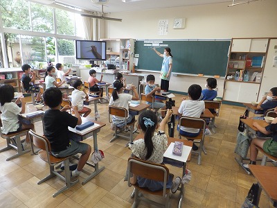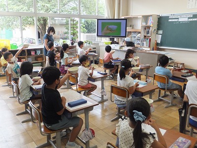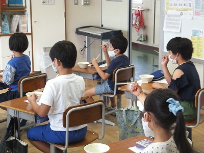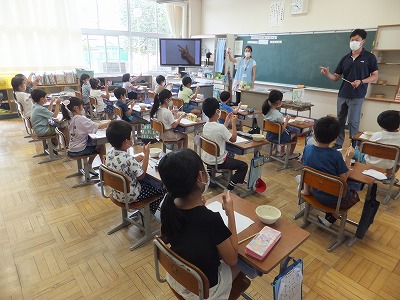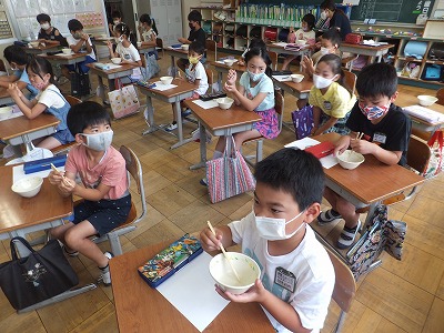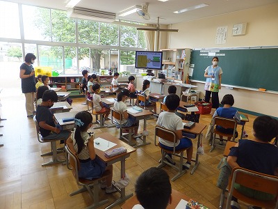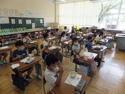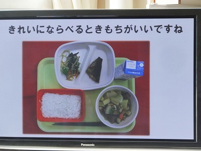 給食センターから学校栄養士の先生に来ていただき、食育の授業を行いました。今日はマナーの学習です。