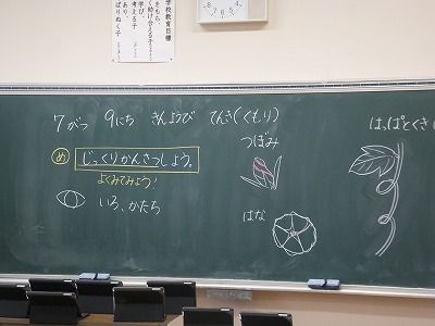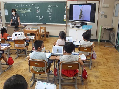 朝顔は、毎日きれいな花が咲いていますが、葉っぱや弦の様子をじっくり観察させました。