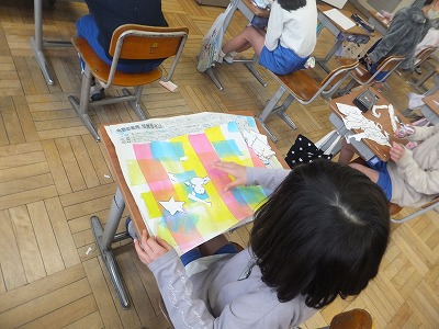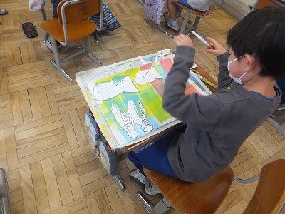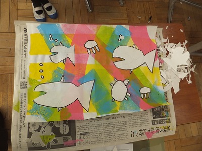 色を付けた版画用紙に、切り抜いたシールを貼っています。