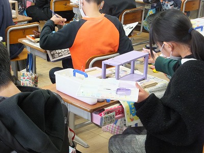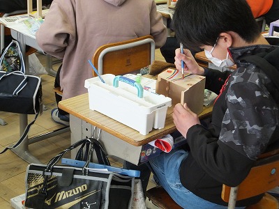 輪ゴムを鳴らすので、いい音とまではいきませんでしたが、自分の作った楽器で嬉しそうに音を出していました。
