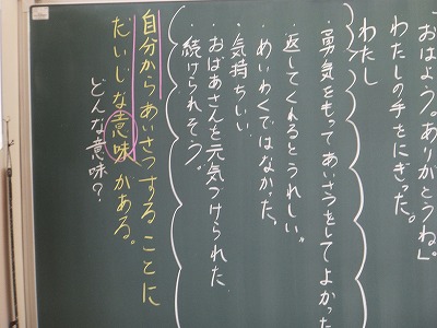 子供達には、「あかるく いつでも さきに つたえる」 あいさつをしましょうと話しています。自分からあいさつするとは、まさに、「さきに つたえる」です。そのことの意味を考えるよい教材です。道徳で学んだことを生活に生かし、下級生の模範になってください。