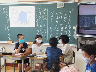 アンケート結果をもとに、自分たちの学級の問題点や、それを改善するための具体的な行動について話し合っています。