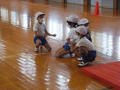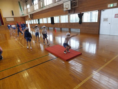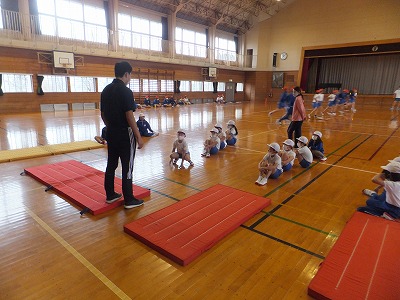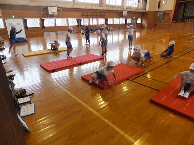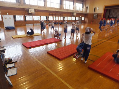 今日は、シャトルランのあとマット運動をしました。主に前転の練習です。