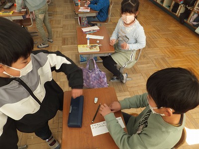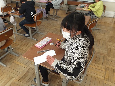 節分に向けて、追い払いたい心の鬼をカードに書いています。