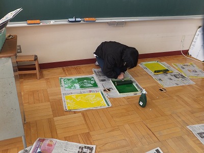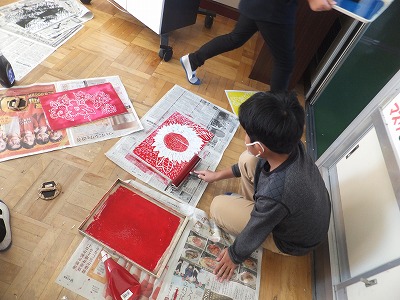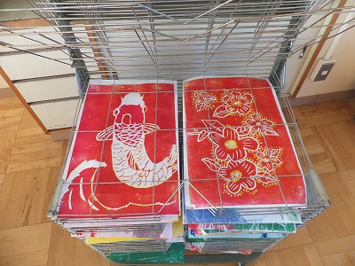 一色目は黄色で刷って、板を洗ってからさらに彫り進め、今度は赤で刷ります。
