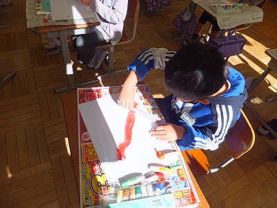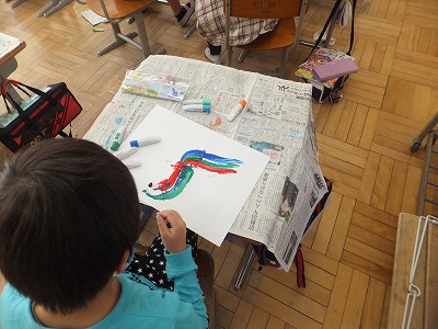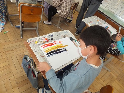 画用紙に絵の具をたらし、それを固い紙で引っ張って伸ばします。