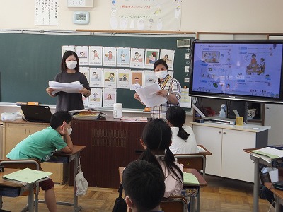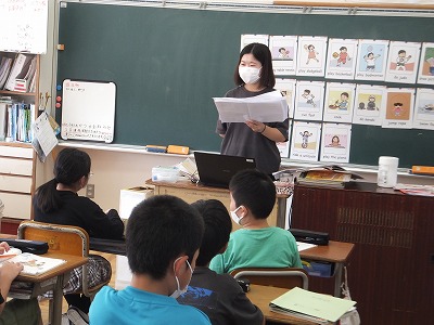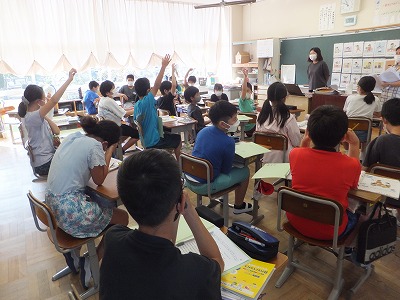 外国語の時間は、ワークシートに書かれたいろいろなことに対して、できるかできないかを〇か✖で回答してもらい、そのワークシートを読み上げて、誰の回答かを当ててもらいました。