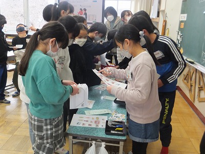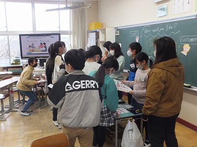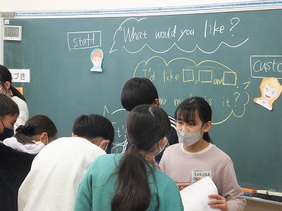 いろいろなお店の店員とお客になって、英語で買い物をする練習をしました。