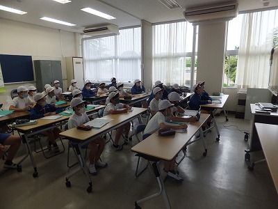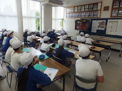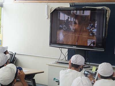 感染症対策のため、2組は最初会議室で、体育館での話をリアルタイムで聞いています。