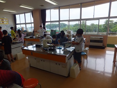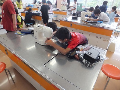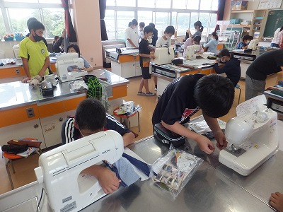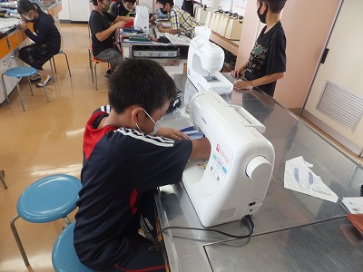 家庭科エプロンづくりをしています。久しぶりにミシンを使います。使い方を覚えているかな?