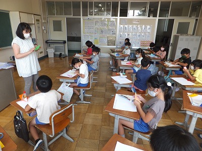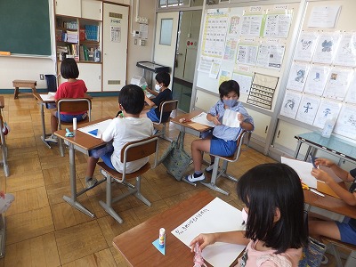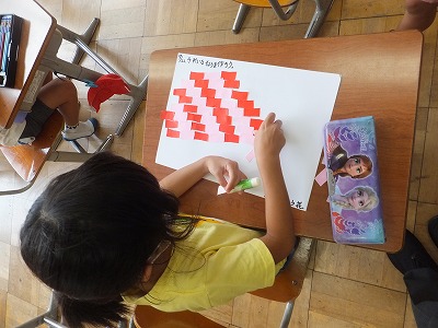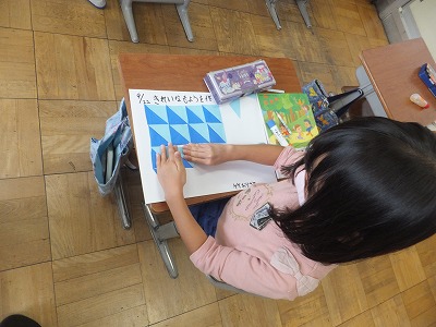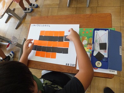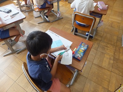 算数で、折り紙を四角形か三角形に等分し、それを切って別の紙に並べ替える作業を行いました。