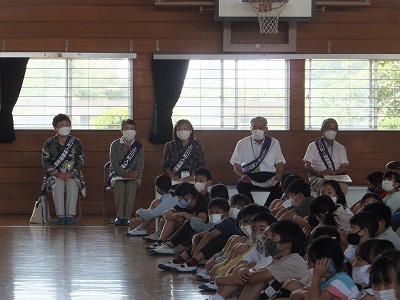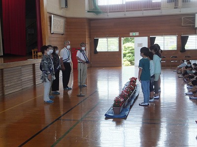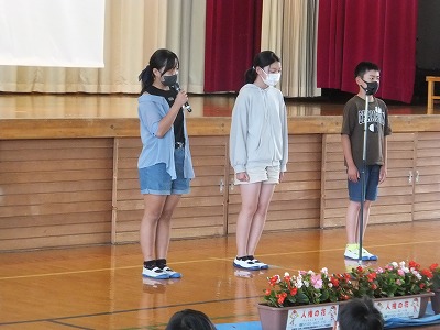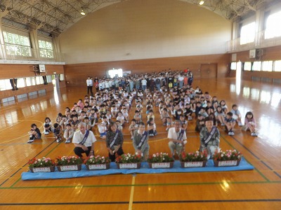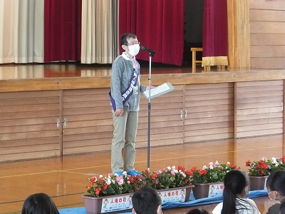 人権擁護委員の皆さんから、人権の花をいただきました。贈呈式の運営は、児童会運営委員の児童です。
