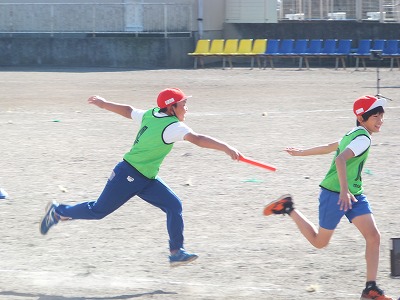 バトンパスができるかどうかのぎりぎりのところで、練習しています。後ろを見ないでバトンパスです。タイミングを合わせるために、何回も練習していました。