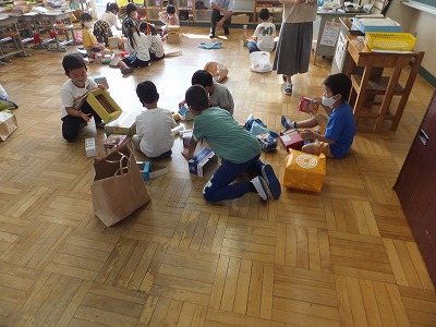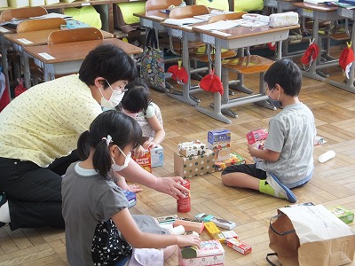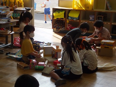 箱を高く積んだ後は、みんなで協力して町を作ります。
