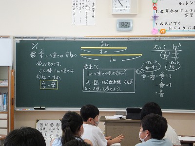 3/4mの重さが2/5㎏の棒の1mの重さは? という問題です。