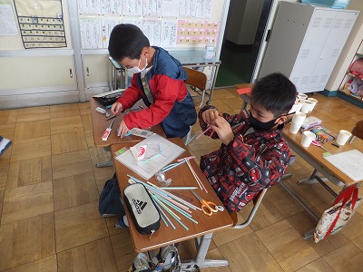 輪ゴムを鳴らすので、いい音とまではいきませんでしたが、自分の作った楽器で嬉しそうに音を出していました。