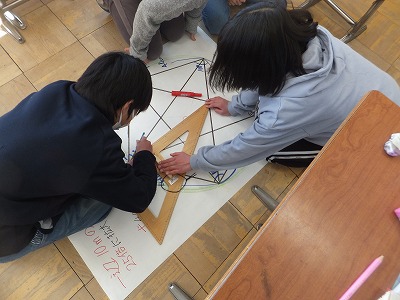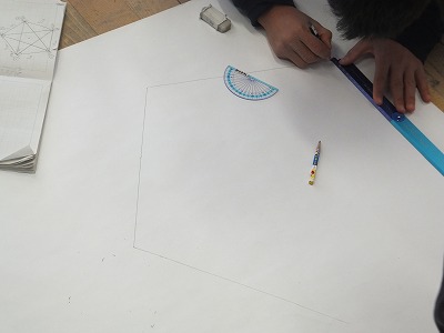 模造紙に描いた図をさらに校庭に拡大して描きます。校庭では、小さな分度器は使えません。さあ、どのように描けばいいのかな?