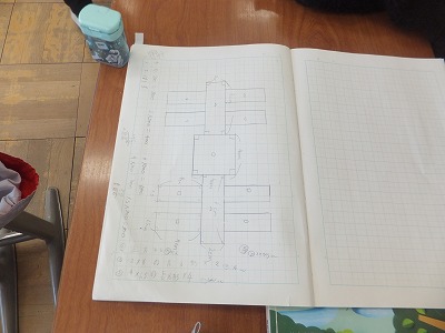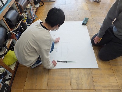 この前の続きで、ノートに描いた原図を模造紙に拡大して描いています。