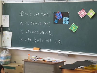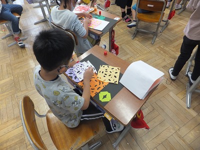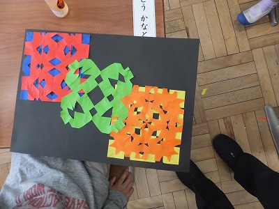 先日は、折り紙を折って、切って模様を作りましたが、今日は、作った模様を黒い髪に貼る遊びをしました。