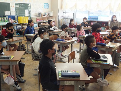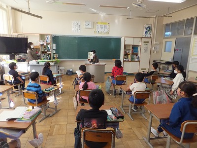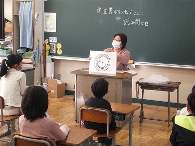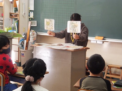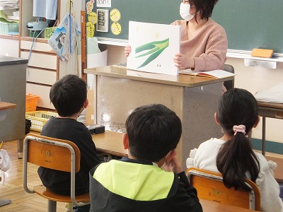 今日は、図書ボランティアの方に読み聞かせをしていただきました。2組は、野菜の断面図から、何の野菜かを当てるお話でした。最初は白黒で。