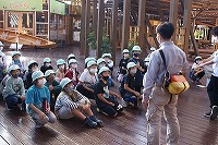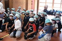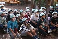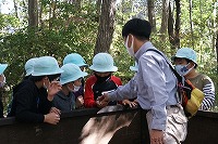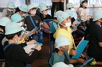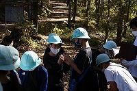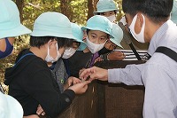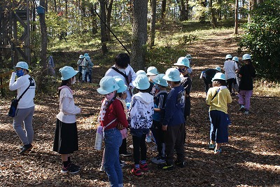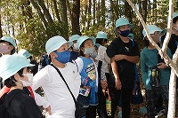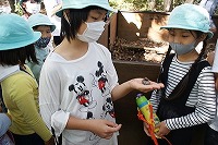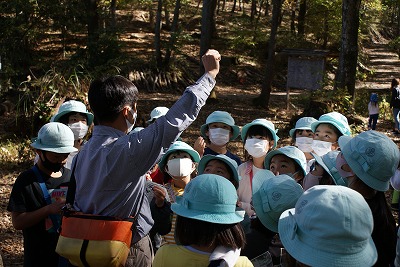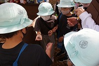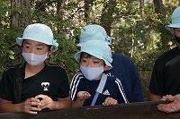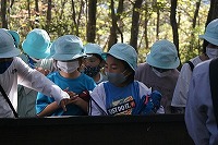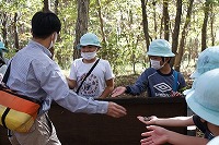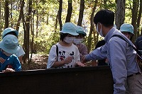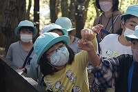 落ち葉を集めておく場所で、いろいろな虫の説明を聞いています。