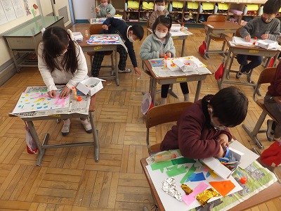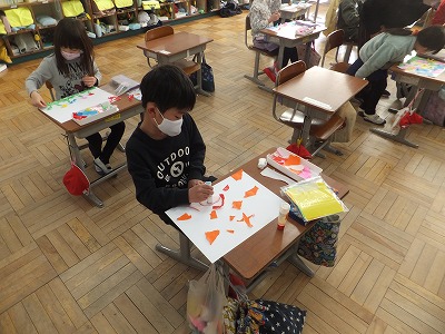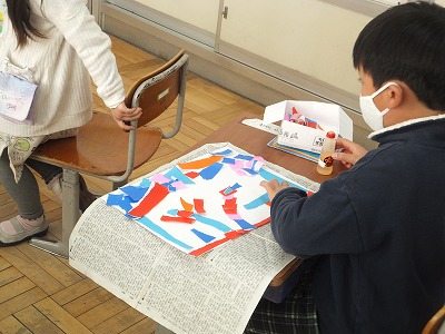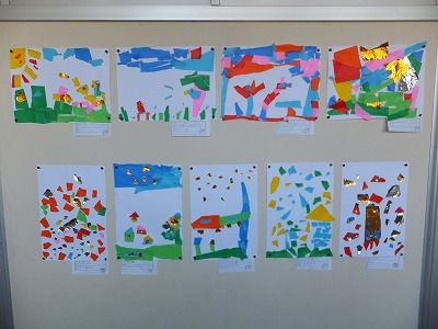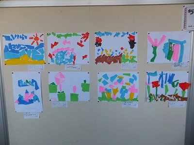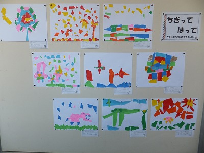 何を描こうかな?思い浮かべた形にちぎった折り紙を貼っていきます。