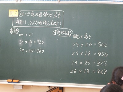 同じ面積を求めるのに、見立てた形が長方形であったり、平行四辺形であったり、それぞれの図形も大きさが違ったりしていました。