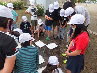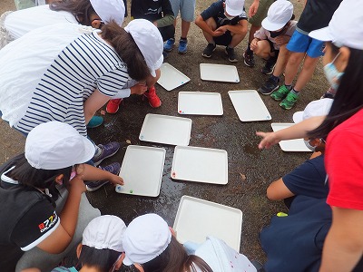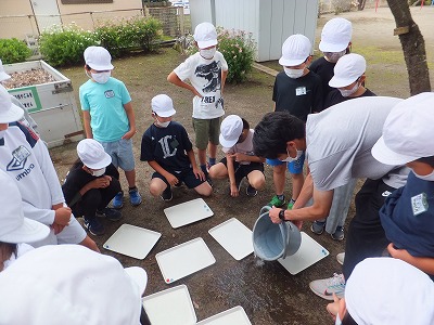 水がどのように流れていくか、校庭で確かめました。