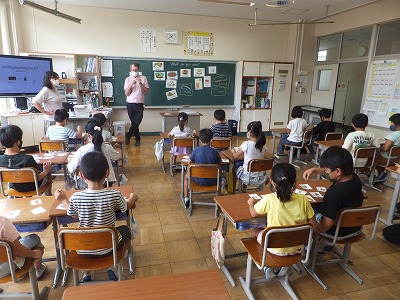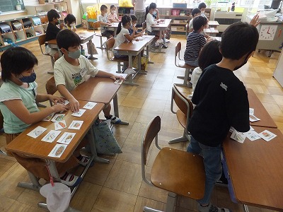 ALTの先生が、欲しい食べ物を三つ言います。三つを聞き取ってカードを揃えます。