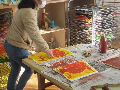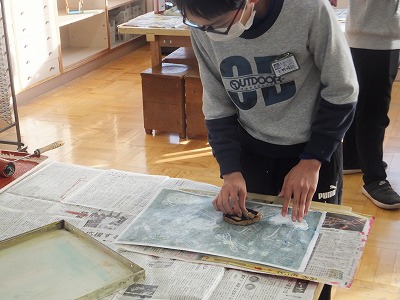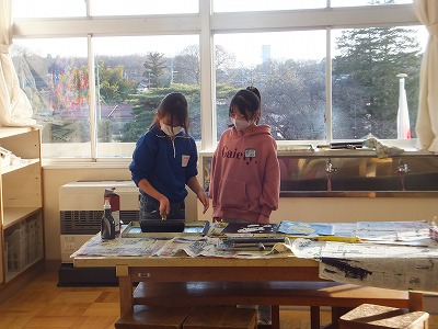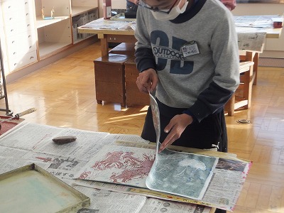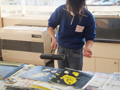 版画もいよいよ刷りに入りました。終わった子は、デザインをやっています。