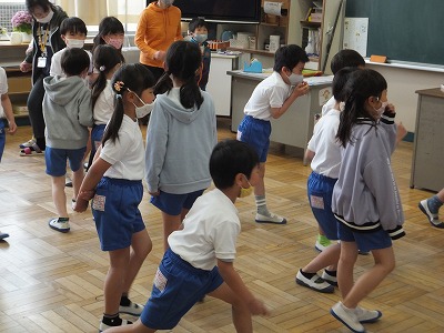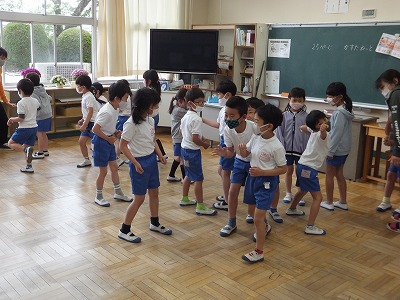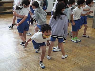 音楽の時間は、曲に合わせて歩いたり、止まったりして楽しみました。