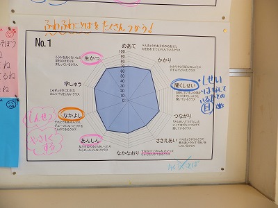 1組に学級力向上プロジェクトのチャートが貼ってありました。第1回目の結果から、「聞くしせい」がよくないという実態を自分たちも感じていることが分かりました。