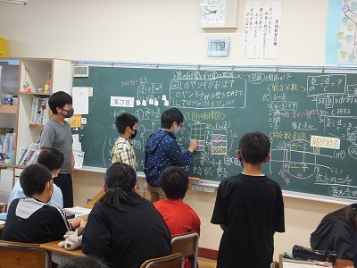 黒板で、友達に図を使って説明しています。