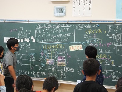 「✕ℓのペンキがあります。このペンキで2/3㎡の壁を塗れます。1ℓでは、何㎡濡れるでしょう。」という問題をいろいろなやり方で求めました。